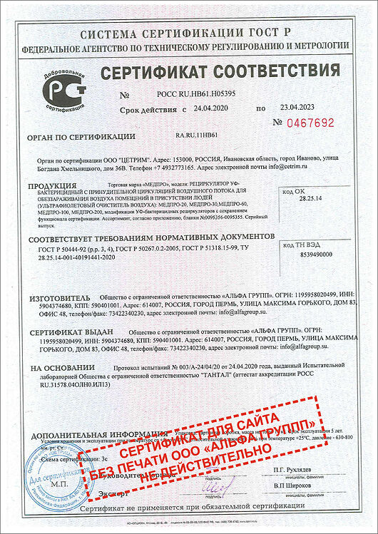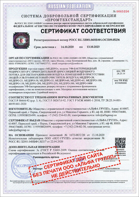 СЕРТИФИКАТ СООТВЕТСТВИЯ РОСС RU.АМ05.Н04341