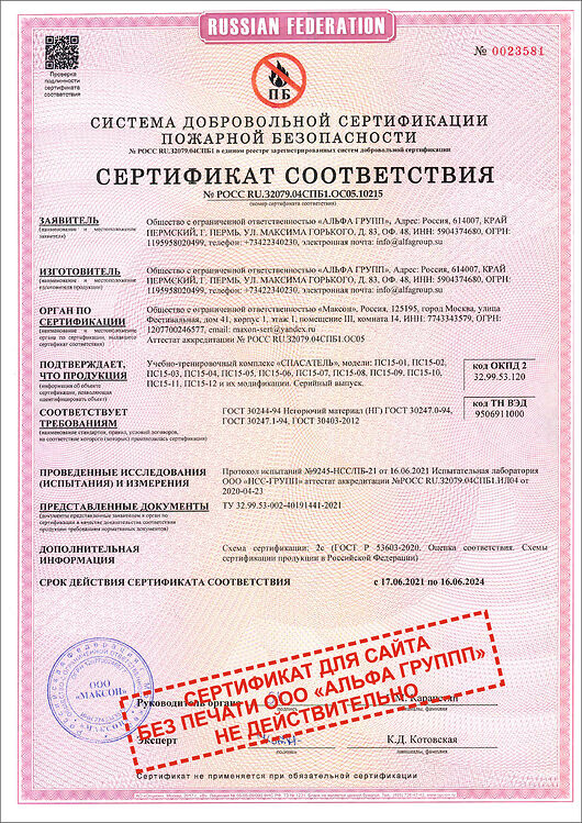 Сертификаты соответствия на учебно-тренировочные комплексы "СПАСАТЕЛЬ"