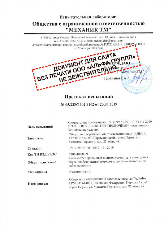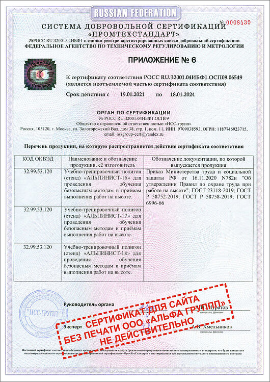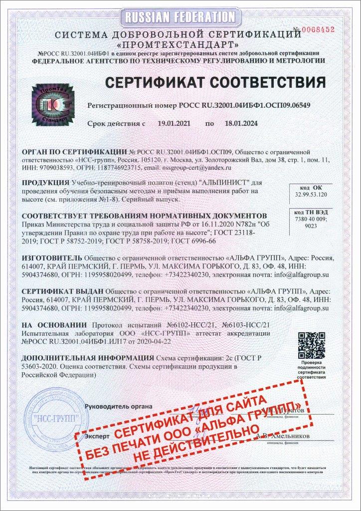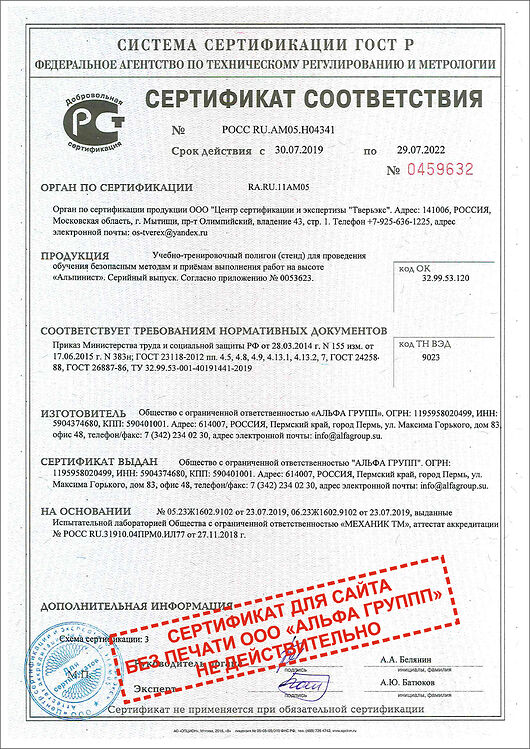 Сертификат ГОСТ Р УЧЕБНЫЙ ПОЛИГОН АЛЬПИНИСТ № РОСС RUАМ05.Н04341(Приложение-1)