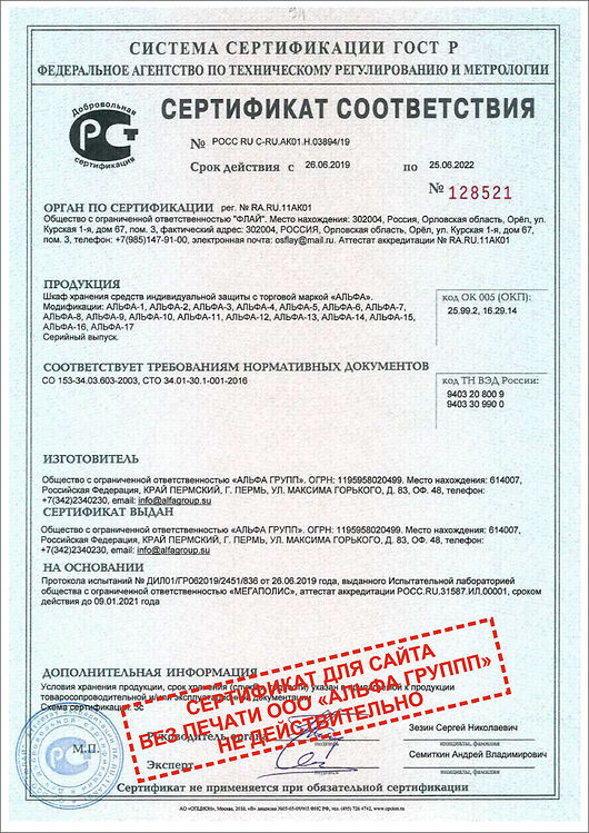 Сертификаты на шкафы хранения средств индивидуальной защиты «АЛЬФА».