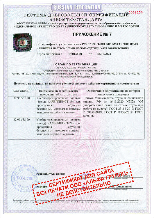 Сертификат ГОСТ Р УЧЕБНЫЙ ПОЛИГОН АЛЬПИНИСТ № РОСС RU.32001.04ИБФ1.ОСП09 (Приложение-7)